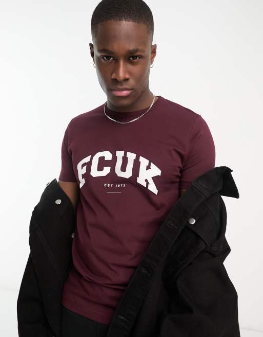 FCUK varsity logo t shirt in burgundy and white ASOS Very well made.