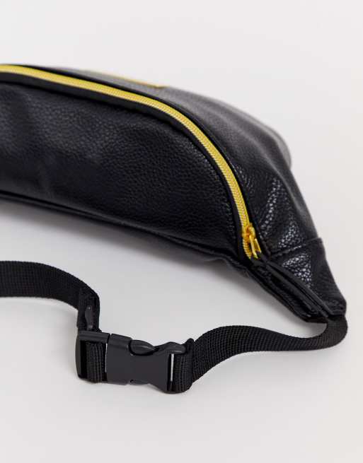 ASOS DESIGN cross body fanny pack in black faux leather with gold zip and metal logo Very well made.
