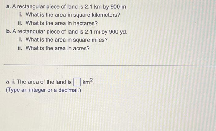 Solved a. A rectangular piece of land is 2.1 km by 900 m. i Very well made.