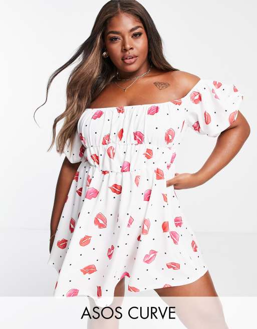 ASOS DESIGN Curve bardot mini dress in white with lips print Very well made.