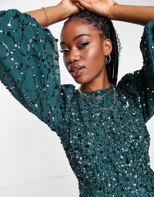 Maya puff sleeve embellished midi dress in emerald green Very well made.