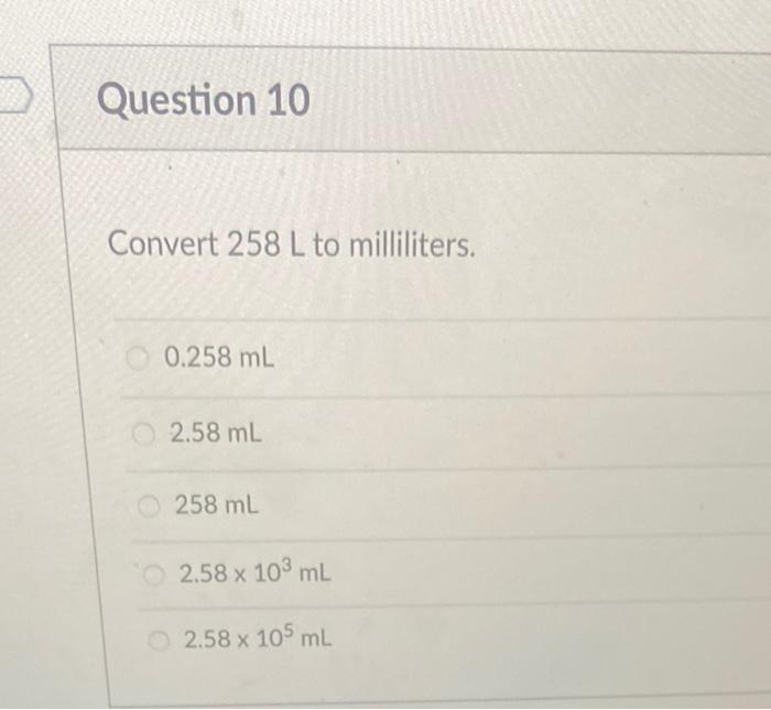 Solved Question 10 Convert 258 L to milliliters. 0.258 mL Chegg Very well made.