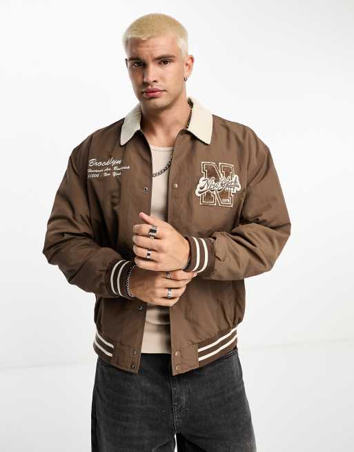 ASOS DESIGN varsity bomber jacket with contrast cord collar in brown Very well made.