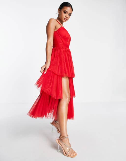 Lace Beads corset tiered tulle midi dress in red Very well made.