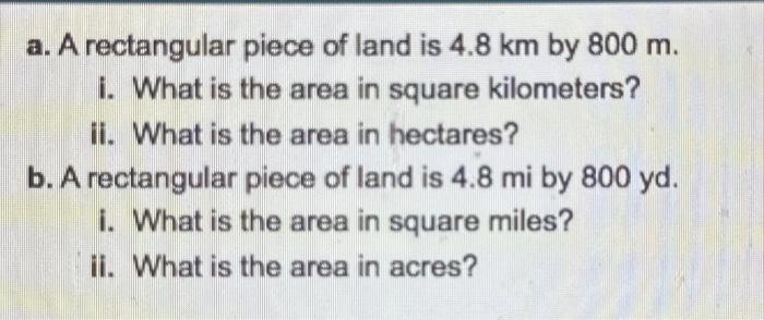 Solved a. A rectangular piece of land is 4.8 km by 800 m. i Very well made.