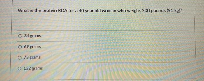 Solved What is the protein RDA for a 40 year old woman who Chegg Very well made.